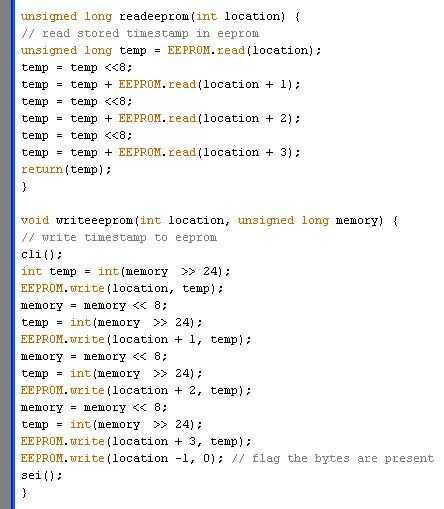 writeeeprom y readeeprom permiten el almacenamiento y recuperación de cadenas de tiempo.