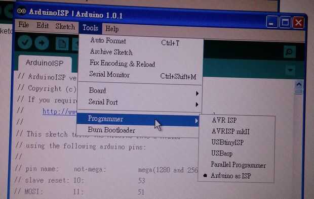 5. Seleccione Herramientas -> Progammer -> Arduino como ISP