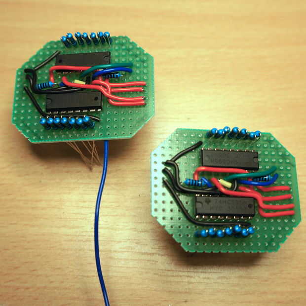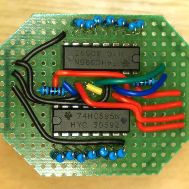 Estoy utilizando registros de desplazamiento (74HC595) a dirección del LED a la 116 con un Arduino con solamente 14 salidas digitales. El registro de desplazamiento tomará un pin de datos sobre una entrada serial y ponerlo hacia fuera como una salida en paralelo de 8 bits. Así que con un cambio de registro puede Dirección 8 LED. La otra parte cool acerca de registros de cambio es que puede encadenarlos. Así que con solo datos de arduino (y un cierre y un reloj) podía conducir todos los LED! Para facilitar un poco el lado de la programación, no hacerlo. Di cada dígito su propia cadena de resistencias de cuatro turnos.