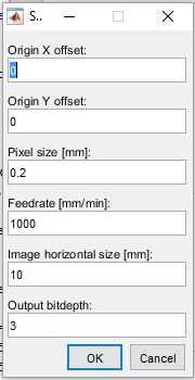 La aplicación es bastante sencilla. Lo pregunto para imagen (formatos de archivo más deberían funcionar, si algo falla convertirla con MS Paint en bmp). Imagen puede ser bw o rgb. Entonces pediré para el archivo de salida en formato .nc. después de ese cuadro de diálogo aparecerá. Tienen algunos ajustes básicos: