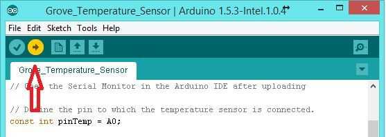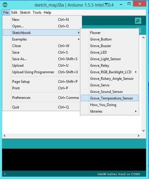 Vaya a "Archivo" -> "Sketchbook" -> "Sketchbook_Grove -> Grove_Temperature_Sensor" para cargar el bosquejo básico de la temperatura.