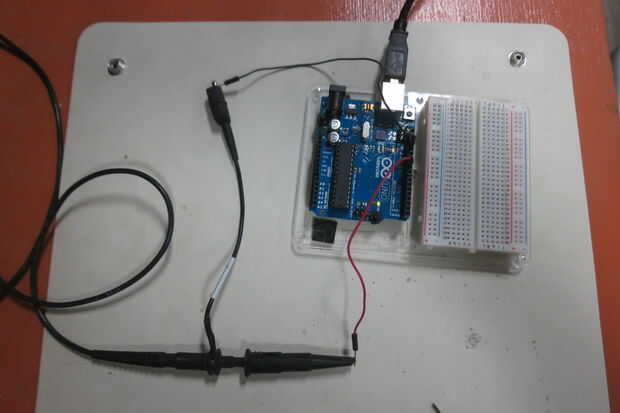 Este paso proporciona una manera fácil de aprender cómo la sonda o del alcance se utiliza para medir componentes de circuito. Usé un Arduino como la fuente de señal.