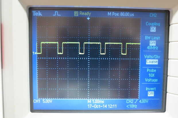 El código era muy rudimentario, sólo lo suficiente para obtener una señal PWM de la Junta. Os adjunto un cable puente al Pin 11 y otro al suelo. A continuación os adjunto la sonda como se muestra en la primera foto. El código era: