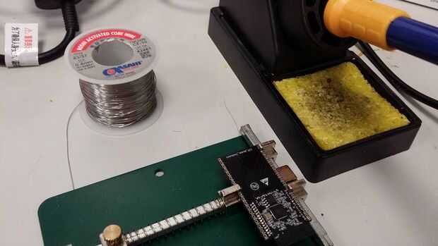 3. Asegúrese de que los pasadores están perfectamente alineados en la Junta ESP32 breakout Junta de placa que se fija con una mordaza de PCB. Flujo de la soldadura se aplican en la superficie de soldadura. Si eres derecho hander, posiciones los pines para soldar para estar en su lado derecho, tal que su soldadura movimiento se mueve hacia la derecha, llevar el fundido 0,4 mm soldadura perpendicular de los pasadores de vecinos. 1,27 mm el espacio puede ser bastante nervio demolición para la soldadura, y los pensamientos al azar de atornillar para arriba es tan fuerte! estancia el foco!