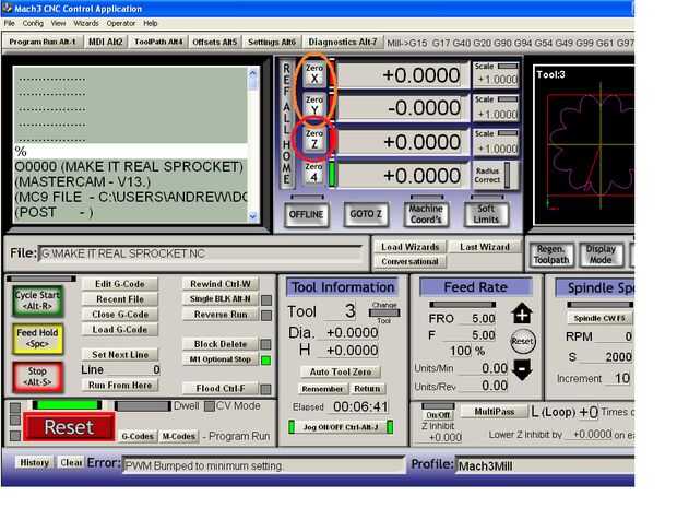 4) mueve el eje y ¼" desde el origen del centro y Baje suavemente el eje z hasta la punta del molino de extremo de 1/8" está tocando la parte superior del piñón blanco. Haz clic en el eje z 0 en Mach3 (un círculo rojo), pero no presione los botones de eje de 0 x (un círculo anaranjado en la imagen) o el eje y 0. Si lo hace, que tenga que empezar!