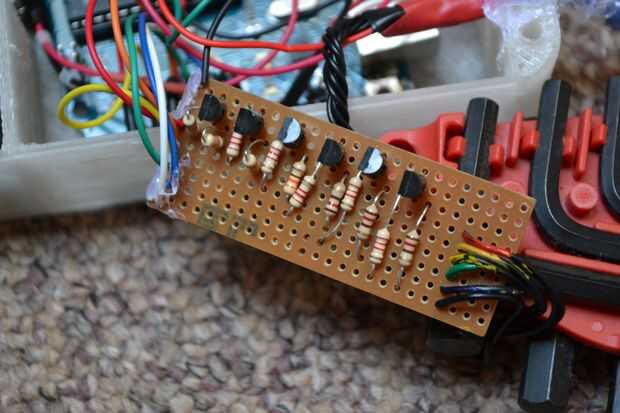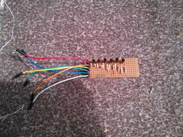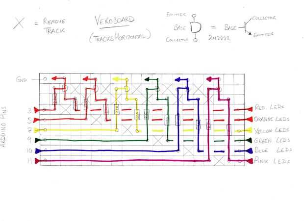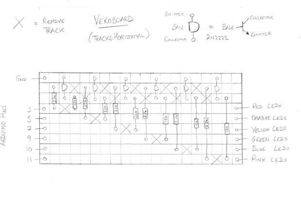 El segundo dos diagramas muestran cómo montar las resistencias y transistores de la placa perforada que se conectará desde el Arduino Uno con los LEDs en su casco. Tenga en cuenta la orientación de los transistores 2N222, puesto que no funcionará si están al revés. También tenga en cuenta la Xs - aquí debe usar un taladro eléctrico y broca pequeña para eliminar suavemente las pistas en la parte inferior de la placa perforada, así que corriente no puede fluir a través de esta área de la Junta.