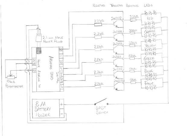Utilizará las clavijas Digital 3, 5, 6, 9, 10 y 11, ya que estos pernos son capaces de utilizar el modo PWM que permite atenuar los LEDs, en lugar de simplemente encenderlos y apagado. Cada pin está conectado a una resistencia Ω k 2.2 y luego el pin de la base de un transistor 2N2222. Cuando un pin del Arduino está conectado, abre el transistor a que está conectado y energía fluye desde la batería, a través de los LEDs, a través de un resistor, a través del transistor (de colector a emisor) y volver a tierra.