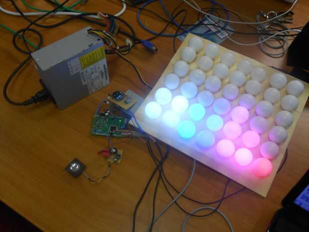 Como LED elegir LED WS2812, principalmente porque todavía tenía algunos de ellos, sino también porque son convenientes usar. El LED se colocaron detrás de pelotas de ping pong, que sirven como difusor de la luz. Los LEDs fueron dispuestos como una matriz de 7 x 6.