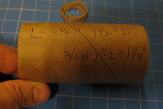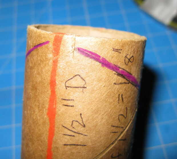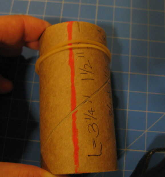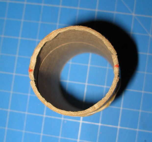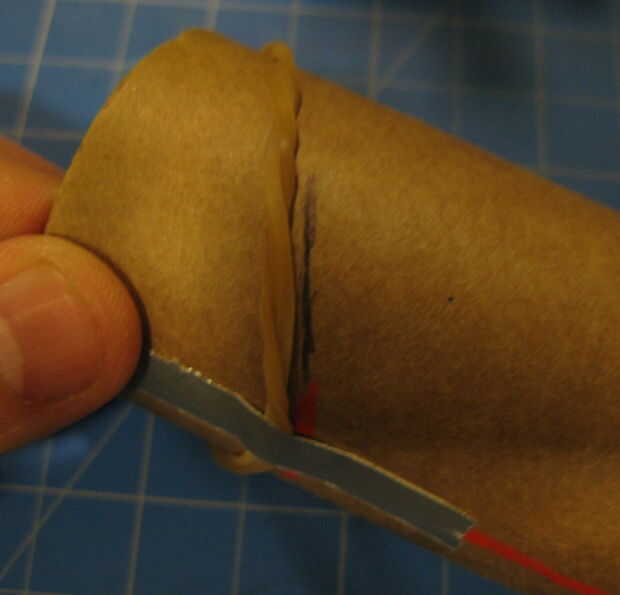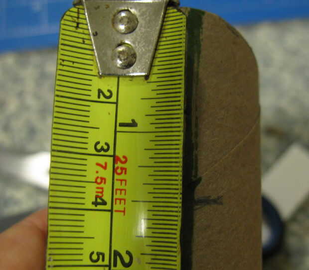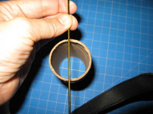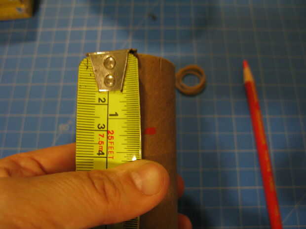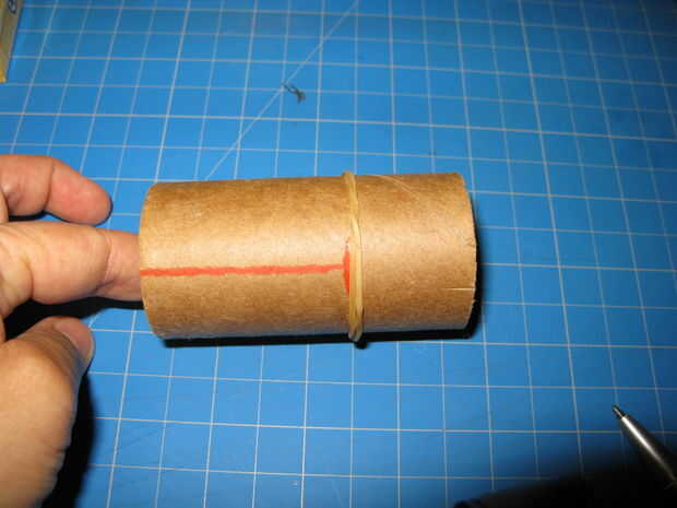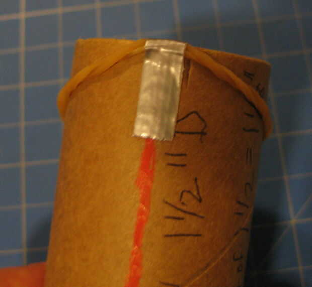 - Al otro lado de la goma hasta el borde del tubo del rodillo en la segunda marca. Asegúrela con otro estrecho trozo de cinta adhesiva.