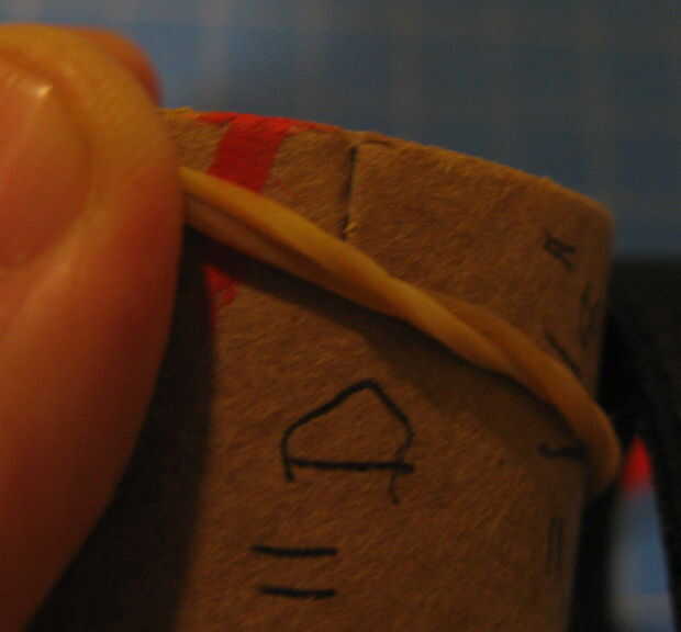 - Encajar la goma alrededor del nivel del tubo con la primera marca (no está, sólo lo suficiente para que no se mueva). Utilice una estrecha franja de cinta adhesiva para fijar la goma con el tubo en la primera boya.