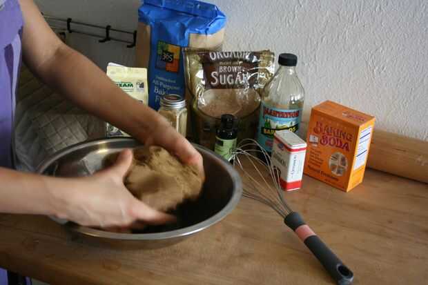 En un tazón grande, bata el azúcar moreno, bicarbonato, jengibre y canela. Batir en la melaza y la mezcla de crema batida hasta bien combinado.