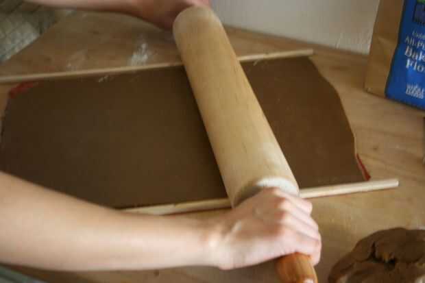 Continuar rodando la masa a un espesor uniforme en la bandeja para hornear. Esto se logra fácilmente colocando dos listones de madera de igual espesor a ambos lados de la bandeja para hornear para el perno de balanceo. Un espesor uniforme es importante. Zonas bajas se hornee más oscuras en color y ser más frágiles. Pieza de aproximadamente 4 tazas por cada 1/2 pulgada de grueso.