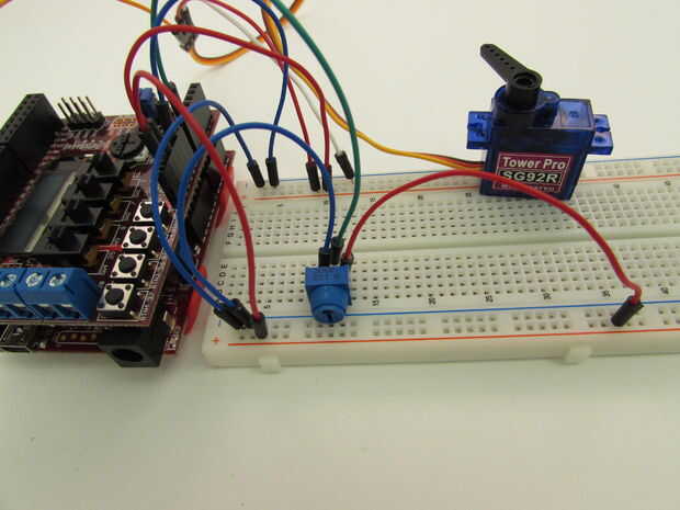 Para conectar el potenciómetro, primero coloque en algún lugar sobre el protoboard. Entonces la porción de esfera hacia usted, para conectar la pierna derecha de la mayoría a los 3.3V línea de autobús y la izquierda del alambre más pierna a una tira de negativos de autobús. La pierna media debe conectarse a un pin analógico en la pletina de E/S básicas, como A0. Se trata de modo que podemos leer cómo mucha resistencia al flujo de corriente está proporcionando nuestro potenciómetro, que a su vez determinará qué tan rápido girará nuestro metrónomo entre 0 y 180 grados.