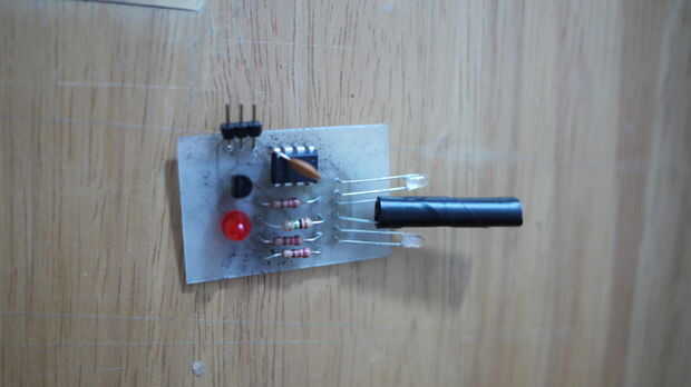 El diseño aprovecha de un AVR barato (computadora en un chip). El equipo pulsos IR LED encendido y apagado y compara la lectura analógica del sensor en cada Estado. Cuando la lectura con las luces encendidas es por encima de la lectura con las luces apagado el pin sentido va alto indicando que el sensor está viendo es la propia luz (reflejada). Hay un LED en el indicador de sentido en este diseño para que pueda ver cuando se activa el sensor. Puede conectar la señal a un microcontrolador como Arduino o Picaxe.