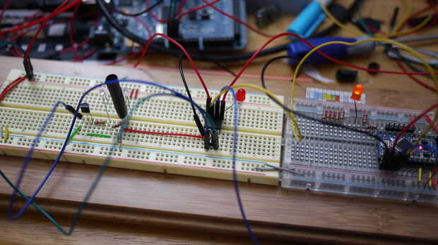 Se trata de un sensor de proximidad de IR muy barato que se pueden hacer con unas piezas baratas y un programador AVR. Usar un Arduino como mi programador en este Instructable.