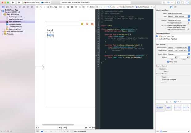 Si lo escribió, usted puede haber notado como fue a lo largo que apareció una ventana en el texto con algunas sugerencias. Esto se llama Autocompletar y ahorra cargas barco de tiempo cuando se está programando. Golpee el cuadrado en la esquina superior izquierdo junto al botón de play para parar la construcción actual de la aplicación (el que está en blanco) que teníamos funcionando. Presione play para reconstruir y ejecutar su aplicación nueva. Una vez el simulador de iOS aparece y carga, intente presionar la tecla. El texto debe cambiar de aburrido viejo "etiqueta" a "Swift es maravilloso!". Ahí lo tienen! Ahora vamos a ejecutar a través de lo que realmente hace el código.