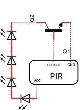es salida Pin se convierten de bajo a alto que resultan en 3.3v suministro en Pin de salida, así que queremos usar ese pin de salida para encender el transistor y de que llevará a sobre y apagado de leds también.