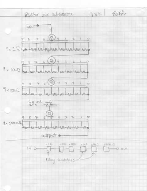 El esquema para esto es muy simple, sólo se basa en el hecho de que añadir resistencias en serie. Básicamente, cada conmutador tiene resistencias soldadas entre contactos adyacentes, y la 'salida' de un interruptor se conecta a la entrada del siguiente. Por ejemplo, el interruptor de orden más bajo, que puede seleccionar de 0 a 9 Ω, tiene una resistencia Ω 1 soldada a través de los terminales que corresponden a la 0-9 posiciones. La 'salida' es el '0' terminal y el centro terminal del interruptor de la entrada. Cuando selecciona '5' en el interruptor, la entrada está conectada a la salida a través de 5 resistencias de 1Ω, dando una resistencia de 5Ω. Dependiendo de la posición del interruptor es, la corriente se dirige a través de un diverso número de resistencias antes de que se envía a la entrada del siguiente interruptor. Como dije antes, la entrada del interruptor de orden más bajo está conectada a la salida del siguiente interruptor y así sucesivamente. Volviendo al ejemplo al final del último párrafo, si elegimos '5' para el interruptor de bajo orden, '3' para el próximo y 6' para el interruptor de orden más alto, la entrada de la más alta orden interruptor se conecta a la salida del interruptor de orden más bajo a través de 6 100kΩ resistencias, resistencias de 10Ω 3 y 5 resistencias de 1Ω, añadiendo una resistencia total de Ω 600.035. También yo podría mencionar que la entrada de la orden más alta interruptor se conecta a uno de dos entradas de la caja, igual que la salida del interruptor de orden más bajo.