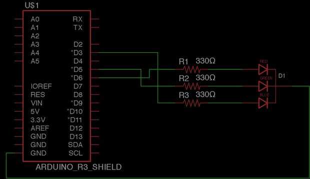 Puede conectar los leds a cualquier pin con capacidades de PWM de la placa. Estoy usando 6 rojo, 5 para el verde y 3 para el azul.
