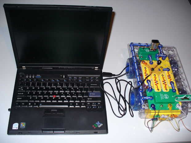 Para ejecutar el programa, asegúrese de que ajustar circuitos Deslice el interruptor S1 está apagado bien el motor izquierdo podría vuelta mientras que el programa aún está descargando para el PICAXE y accidentalmente puede desconectar el cable de programación como el robot gire a la derecha. A continuación, asegúrese de que esté encendida el Snap circuitos 9 voltios Batería bloque B5 o el programa no se descargará en el PICAXE. Conecte el Snap circuitos programación Cable USB a su ordenador.