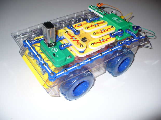 Colocar el robot en el suelo una distancia segura de cualquier obstáculo. A continuación, encienda el Snap circuitos Deslice el interruptor S1 a. Cuando estés listo para ver las pruebas de motor, encienda el Snap circuitos 9 voltios Batería bloque B5 y reloj robot realizar las pruebas de motor.