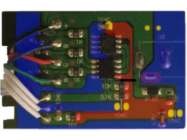 Medí la corriente absorbida por el dos ICs en alrededor de 1 mA, que es bien dentro de las capacidades de abastecimiento actuales de la mayoría de microcontroladores, por lo que no será necesario un transistor o MOSFET y las ICs puede ser alimentada directamente en el microprocesador. Todo lo que se requiere, entonces, es desconectar los dos ICs el carril de alimentación de +4.7 voltios (mediante la reducción de la huella de la placa de circuito en la línea negra), atar el microcontrolador +4.7 voltios y tierra y conecte uno de los pines del microcontrolador a los pines de alimentación de los dos ICs en el circuito del controlador de LED, para que el microcontrolador puede alimentar el ICs a voluntad.