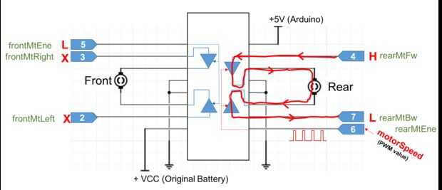Por ejemplo, si queremos avanzar el coche, la función "moveForward ()" debe poner el en alto del pin 4 y pin 7 en bajo, esto hará actual flujo de "derecha" como se muestra en el diagrama de segundo anterior.
