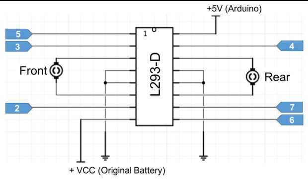 Los motores delanteros y traseros están conectados al puente H como se muestra en el diagrama de arriba y cada uno de los pines de Arduino, que deben definirse como una salida durante la instalación, tendrá una variable asignada: