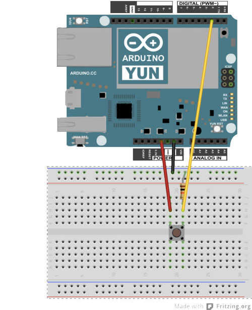 Usted tendrá que conectar el botón como se muestra en la figura. Uno de los extremos del botón está conectado al Pin Digital 2. El Arduino Sketch lee el valor en el pin 2. Si el valor es alto (boton), sólo entonces reproduce el clip de sonido.