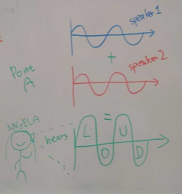 Puesto que no hay ningún desplazamiento de fase entre las dos señales de sonido, Angela oye agregando para arriba para hacer una gran grasa sinusoidal con una amplitud grande. Se puede ver en el diagrama anterior.