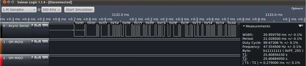 Para este Instructable primero un Tektronix 1241 Analizador lógico se utilizó entonces una Saleae Logic que permitió medir con precisión la frecuencia con la que los marcos de los datos fueron enviados (22ms) incluyendo el formato, cantidad y contenido de caracteres en cada byte de su serial protocolo (8 bits de datos, sin paridad, 1 bit de parada), así como de su tasa (133000 baudios). Cada marco contiene 14 bytes que pueden ser convenientemente representados en notación hexadecimal.