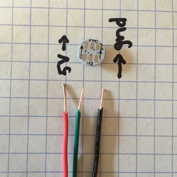 - Mira en la parte posterior de su NeoPixel. Hay seis puntos de soldadura. Usted quiere soldar los cables al lado de Din (no duda). Conectar el cable rojo con el +, el negro con el - y el verde en el centro.