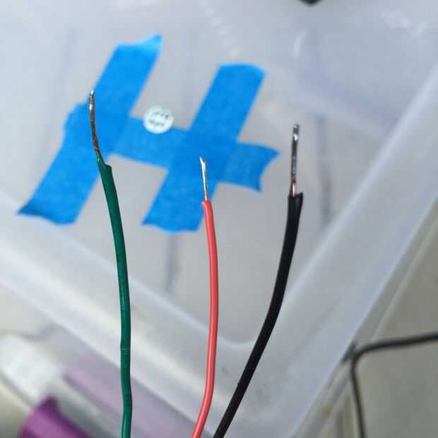- Cortar tres trozos de alambre de calibre 22, núcleo macizo. Si tiene tres colores, que es grande. He seguido el mismo patrón que los dos sensores. Rojo para la energía, negro para la tierra y verde para la comunicación con el Arduino.