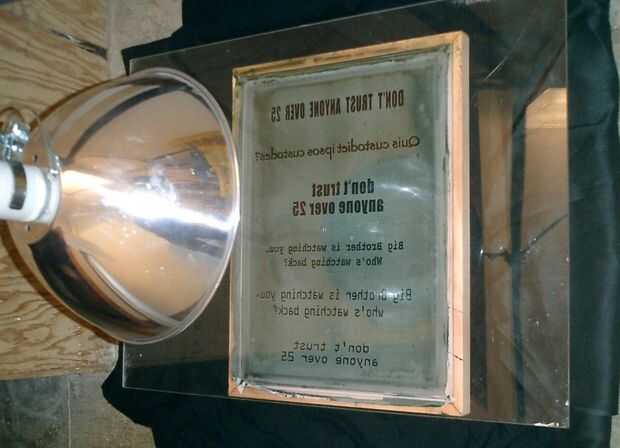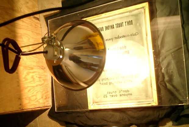 Con la bombilla y reflector todos juntos, colgar para que la lámpara sea 12 pulgadas (para una pantalla de 10 x 14) sobre la superficie de la pantalla, centrada. Coloque a la tela negra en el suelo donde se colocará la pantalla. Tienen su imagen en transparencias y acrílico listo y para verificar que ya tienes las transparencias en la orientación correcta.