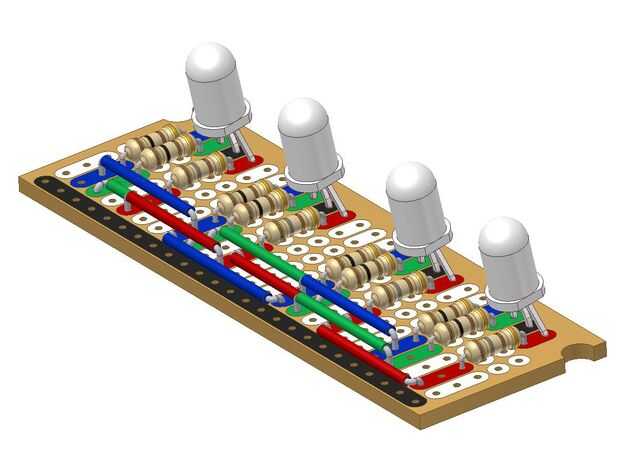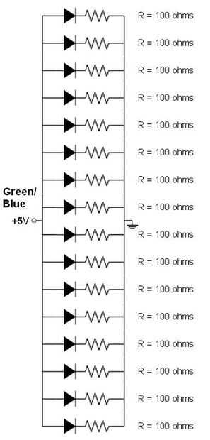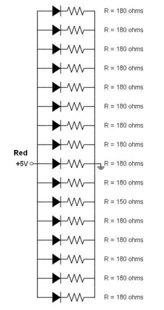 El LED del circuito consta de tres lazos del microcontrolador conectado: uno para el rojo, uno verde, uno para el azul. Cada LED tiene cuatro diferentes: rojo, verde, azul y tierra. Cada uno de los cables de color se conecta a su respectivo lazo a través de un resistor limitador actual en paralelo con los otros conductores del mismo tipo de color. Los conductores de tierra están conectados juntos.