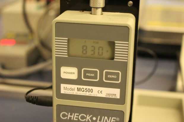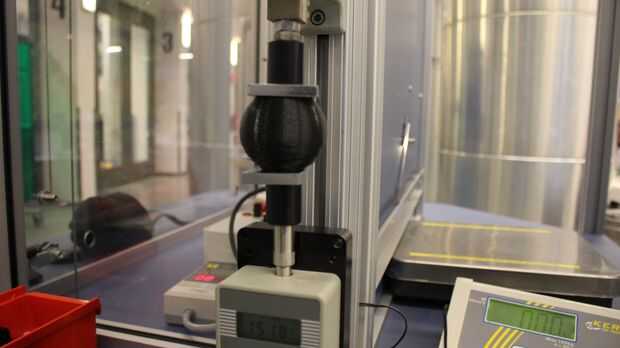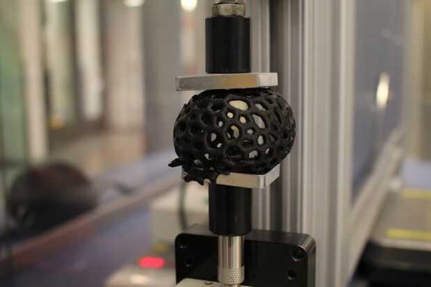 Para obtener una indicación de la diferencia de fuerza entre ambos modelos impresos, examinamos cuánto fuerza de compresión podrían resistir las estructuras. Ambas estructuras presente a una prueba de compresión, y se midió la carga máxima. Se utilizó una configuración muy básica prueba, que consiste en un soporte de taladro como mecanismo y un sensor de presión. En la primera prueba, las capas impresas fueron colocadas horizontalmente, mientras se aplica fuerza en sentido vertical. En esta configuración, la estructura de la cáscara podría resistir 2200, mientras que la estructura de Voronoi sólo pudo resistir 860N. Una observación que debe hacerse aquí es que hemos podido determinar cuándo exactamente la primera deformación plástica importante ocurrió cuando la cáscara sólida. Grandes deformaciones aparecieron alrededor 2200N. Cuando continuamos, la fuerza máxima aumentó a 2776N, que era el máximo que podríamos aplicar. La estructura de Voronoi desahogó en 860N.