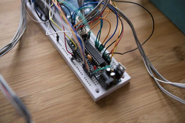 Para leer este valor, tuve cable los pines en entradas digitales del Arduino, leer los valores y cambio en un byte. Puesto que los contactos no siempre cambian inmediatamente los valores esperados al cambiar la selección del codificador, agregué algunos código debounce. A continuación informará el estado del codificador después de que ha permanecido invariable durante milisegundos DEBOUNCE_TIME (en este caso, 10). Tenga en cuenta los cables siguientes, desde el esquema: