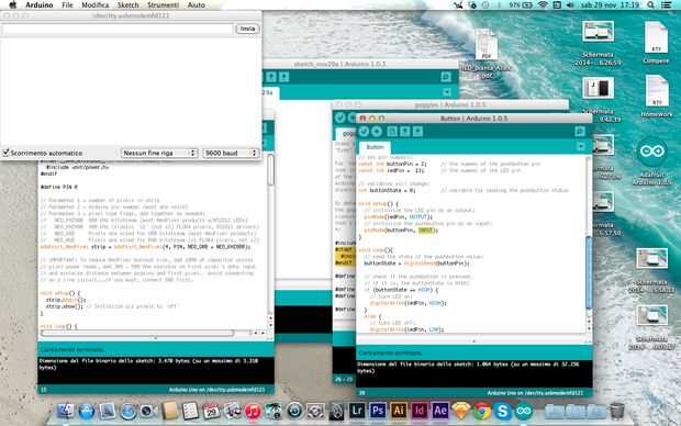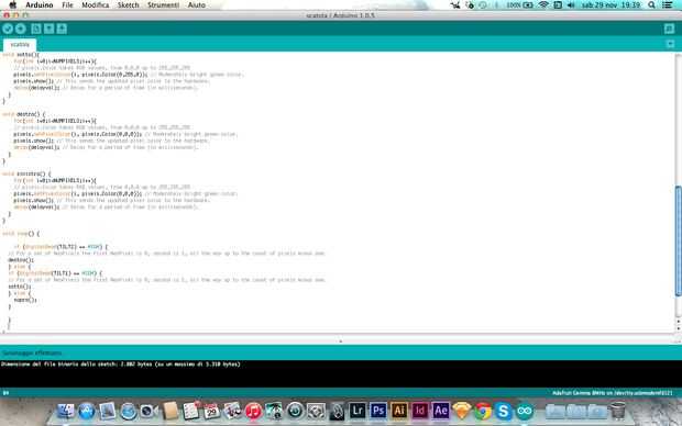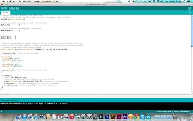 -definir el sensor de inclinación 2 como un botón así que si usted girar 180° para arriba (sopra) y abajo (sotto) cambiará de color de rojo a verde: mira sopra() vacío y vacío sotto() y si gira a la derecha (la destra) o izquierda (sinistra) 180° está apagado, no hay color: aspecto destra() vacío y vacío sinistra()