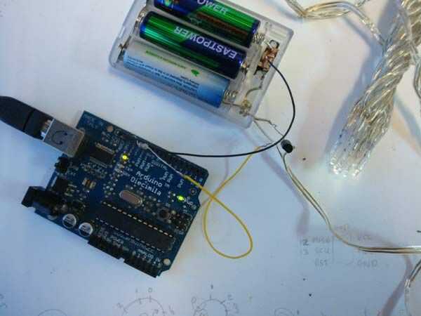 El Atmega328 trabajó en 2 baterías del AAA en 2,8 voltios y el LED se utilizaron sin resistencias. (En el Arduino con 5V que tienes que usar una resistencia para que su LED no explotar).