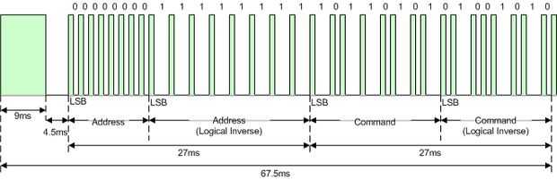 El protocolo de transmisión de infrarrojos NEC utiliza pulso distancia codificación de los bits de mensaje. Cada ráfaga de pulso (marca – transmisor RC) es 562.5µs de longitud, a una frecuencia de portadora de 38 kHz (26.3µs). Lógicas bits se transmiten como sigue: