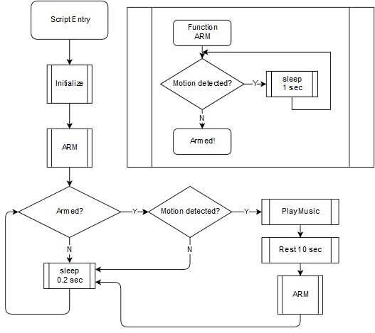 Ahora usted debe oír un "woooup" que dicen el script se está ejecutando y el sensor de PIR está armado. Ahora si activan la detección de movimiento, debe aquí su música comenzar a jugar. Después de terminar jugando el script realizará durante 10 segundos antes de rearmar. También se armará no si la entrada es alta, significa no se redispare si hay continua movimiento.