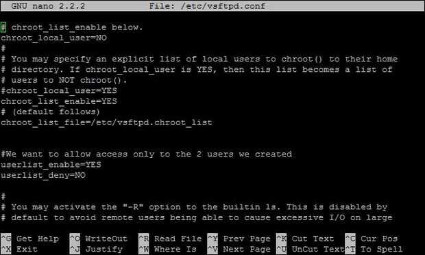 El siguiente paso es contener nuestros usuarios FTP a su directorio home. Este método es conocido como "Cárcel" de la raíz y utiliza el comando chroot. Revisar la siguiente imagen y su propio archivo en consecuencia. Las dos líneas fueron agregadas por mí, así que no trate de encontrar en su propio archivo (al menos no existieran en la mía). Añadir para permitir sólo una lista de usuarios para iniciar sesión en el servidor. Tenga en cuenta que declaramos un nombre de archivo: vsftpd.chroot_list y ahora tenemos que crear ese archivo ya no existe. Crear y agregar los dos usuarios que creado, cada uno en su propia línea. Cree otro archivo llamado vsftpd.user_list y agregue estos dos usuarios allí también. Ambos de los archivos deben estar en el directorio/etc.
