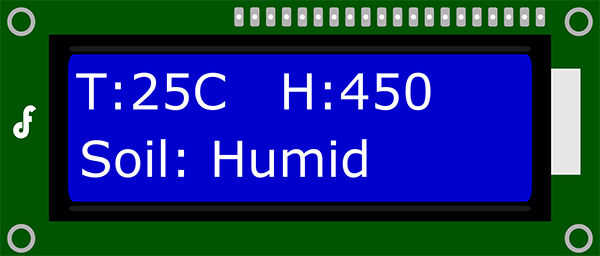 Después de cargar el sketch, el LCD muestra la temperatura y humedad, así como la condición de humedad del suelo.
