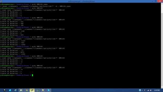 System.out.println("X-Axis of Rotation : %d %n", xGyro); System.out.println("Y-axis of Rotation : %d %n", yGyro); System.out.println("Z-axis of Rotation : %d %n", zGyro); La salida del sensor se muestra en la foto de arriba.