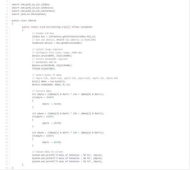 import com.pi4j.io.i2c.I2CBus;import com.pi4j.io.i2c.I2CDevice;import com.pi4j.io.i2c.I2CFactory;import java.io.IOException;public class BMG160{ public static void main(String args[]) throws Exception{ // Create I2C bus I2CBus bus = I2CFactory.getInstance(I2CBus.BUS_1); // Get I2C device, BMG160 I2C address is 0x68(104) I2CDevice device = bus.getDevice(0x68);// Select range register // Configure full scale range, 2000 dps device.write(0x0F, (byte)0x80); // Select bandwidth register // Bandwidth 200 Hz device.write(0x10, (byte)0x04); Thread.sleep(500); // Read 6 bytes of data // xGyro lsb, xGyro msb, yGyro lsb, yGyro msb, zGyro lsb, zGyro msb byte[] data = new byte[6]; device.read(0x02, data, 0, 6);// Convert data int xGyro = ((data[1] & 0xFF) * 256 + (data[0] & 0xFF)); if(xGyro > 32767) { xGyro -= 65536; }int yGyro = ((data[3] & 0xFF) * 256 + (data[2] & 0xFF)); if(yGyro > 32767) { yGyro -= 65536; }int zGyro = ((data[5] & 0xFF) * 256 + (data[4] & 0xFF)); if(zGyro > 32767) { zGyro -= 65536; } // Output data to screen System.out.printf("X-Axis of Rotation : %d %n", xGyro); System.out.printf("Y-axis of Rotation : %d %n", yGyro); System.out.printf("Z-axis of Rotation : %d %n", zGyro); }} La biblioteca que facilita la comunicación i2c entre el sensor y la placa es pi4j, sus diferentes paquetes I2CBus, I2CDevice y I2CFactory ayudan a establecer la conexión.