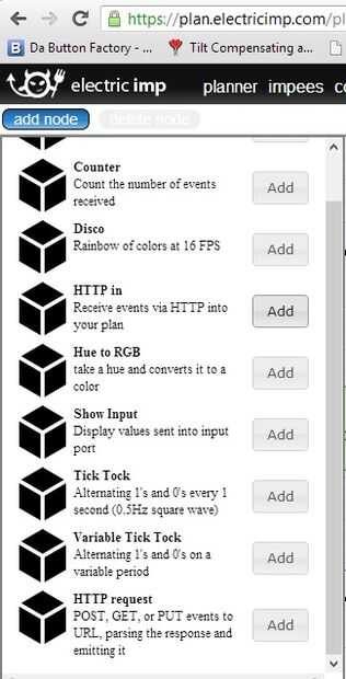 A fin de conectarse a la Imp a través de HTTP, debe configurar un nodo en HTTP. En el botón Añadir nodo en el planificador, haga clic en Agregar para agregar un HTTP en nodo. Este es el nodo que recibe mensajes desde el smartphone. El smartphone en esta aplicación se conecta a un servidor Web. Servidor Web envía mensajes a través de HTTP Post a la URL especificada en el planificador. Cada nodo tiene una dirección URL determinada.