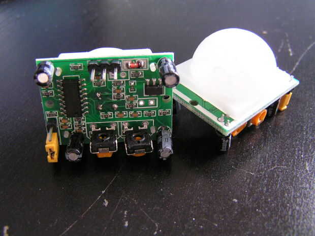 El pin de señal del movimiento sensores deberá estar conectado a los pines de Arduino 8 y 9 para abajo y activa respectivamente, también necesitan + 5v y GND. Mientras estás allí, ajustar los potenciómetros de dos ajuste de ellos totalmente hacia la derecha. Esto reduce la longitud de detección (energía) y la duración de gatillo a valores mínimos.