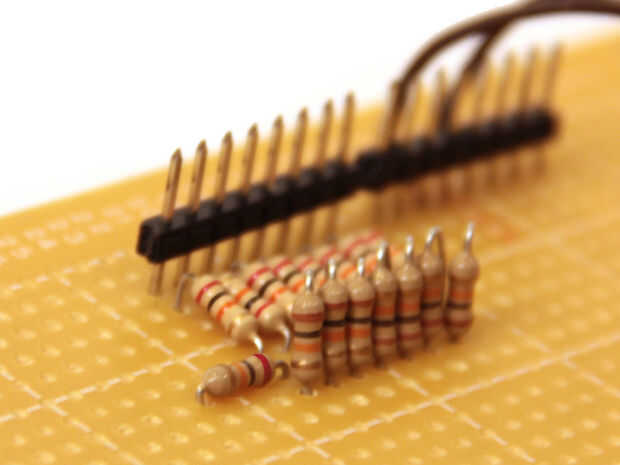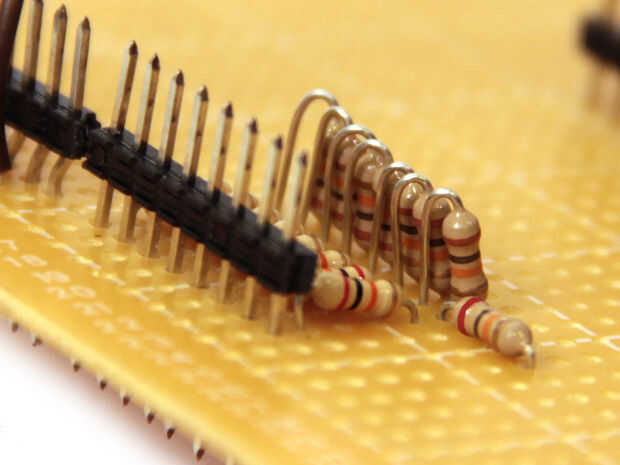 Configurar una interrupción de temporizador incrementos de la variable t en una frecuencia de 40kHz. Una vez que t alcanza 627 restablece a cero (esto ocurre con una frecuencia de 40.000/628 = 63 Hz). Mientras tanto, en el bucle principal del Arduino envía un valor entre 0 (00000000 en binario) y 255 (11111111 en binario) a los pines digitales 0 al 7 (PORTD). Calcula este valor con la siguiente ecuación: