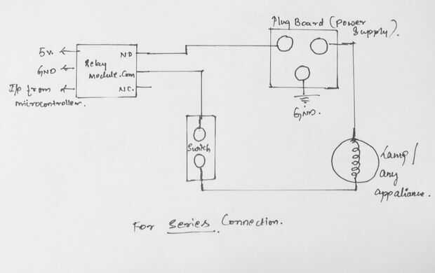 Esto se hace conectando los terminales NO(normally open) y común del relé a los dos terminales del interruptor. Este tipo de conexión garantiza que el interruptor puede ser operado independientemente por cualquiera de dos maneras, es decir manualmente o a través del mando a distancia.