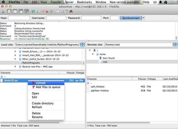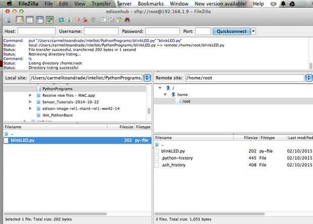 Una vez completada la transferencia, que debería llevarlo sobre un segundo debe ver la blinkLED.py en el lado remoto que es la carpeta raíz en la Edison.